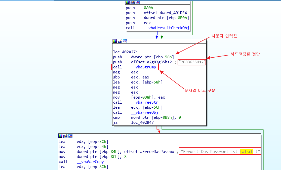 __vbaStrCmp를 통해 두개의 값을 비교하여 정답여부를 결정한다.