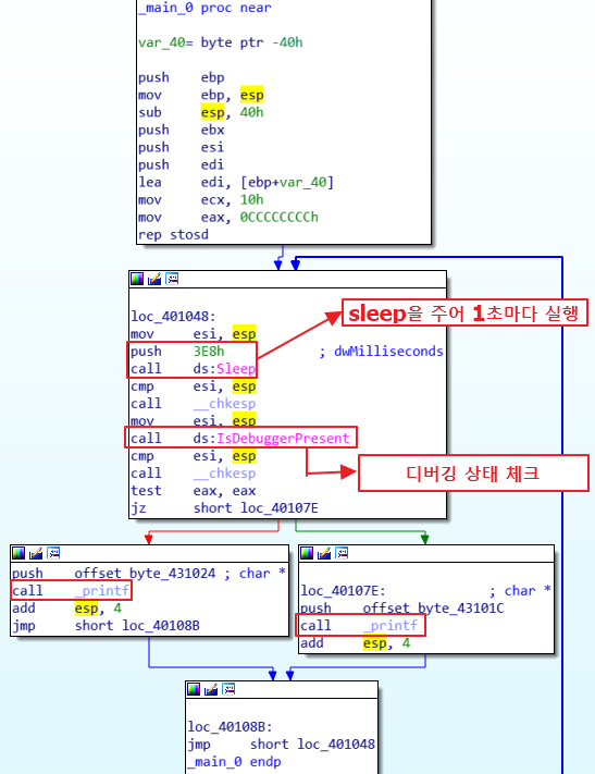 먼저 loc_401048의 push 3E8h를 10진수로 바꾸면 1000이 된다. 이것을 스택에 저장 후 Sleep을 콜하여