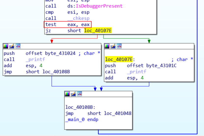 따라서 test eax, eax는 0이 반환되면 참이 되는 Instruction이므로 IsDebuggerPresent의 결과 값이 eax에 저장되고, eax가 0인지 확인하여 jz를 통해 분기할 것이라 볼 수 있다.