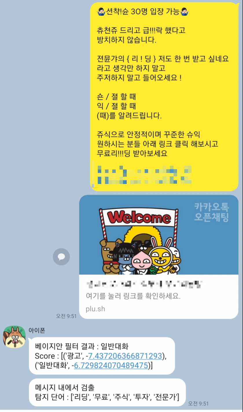 카카오 채널 메시지 유형은 그나마 특징이 뚜렷해서 대응할 수 있었지만 일반 메시지로 위장해서 광고하는 메시지는 어려웠죠..